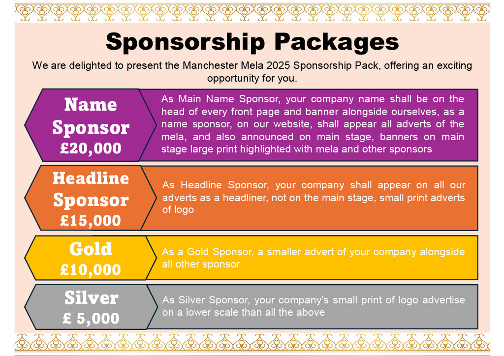 We offer various sponsorship packages, as previously mentioned, tailored to meet your marketing objectives and budget. Join us in making Manchester Mega Mela 2025 a memorable success!